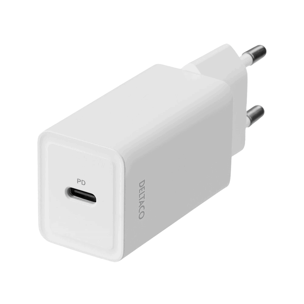 Kompakt USB-C Power Delivery väggladdare för snabbladdning av t.ex smartphones, surfplattor och andra USB-C enheter.